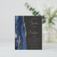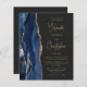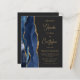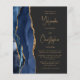 The left-hand edge of this elegant modern wedding invitation features a navy blue watercolor agate border trimmed with faux gold glitter. The customizable text combines trendy gold-coloured script and sans serif fonts on a dark background. The reverse side provides space for wedding details on a solid dark background, along with a QR code guests can scan to visit your website and RSVP, which saves the cost of printing and mailing separate RSVP cards.