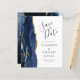 The left-hand edge of this elegant modern wedding save the date card features a navy blue watercolor agate border trimmed with faux gold glitter. The customizable text combines charcoal grey handwriting, copperplate and italic fonts on a white background. The reverse side features a matching navy blue and gold agate design.