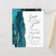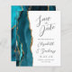 The left-hand edge of this elegant modern wedding save the date card features a teal blue watercolor agate border trimmed with faux gold glitter. The customizable text combines charcoal grey handwriting, copperplate and italic fonts on a white background. The reverse side features a matching teal and gold agate design.