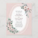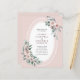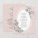 Budget Boho Dusty Pink Floral Roses and Eucalyptus Watercolor Greenery Lace Oval Wedding Invitation... Our affordable "All in One" floral wedding invitation features dusty pink roses and eucalyptus greenery on a white lace oval frame displaying your personalized invitation text. The back of the invitation contains all of the details you would typically see on separate cards within the wedding packet. The background on front and back of the invitation is romantic blush pink. This modern style front and back wedding invitation was designed to be both elegant and budget conscious... not to mention time-saving. All example text can be easily revised with your own information on the personalization template.