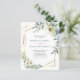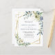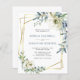 Budget All in One Dusty Blue Eucalyptus Floral Gold Geometric Frame Wedding Invitation... Our unique affordable "All in One" floral wedding invitation features elegant watercolor floral and eucalyptus arrangements in white and shades of dusty blue on a geometric gold frame bordering your invitation text. The back of the invitation contains all of the details you would typically see on separate cards within the wedding packet. This modern style front and back wedding invitation was designed to be both elegant and budget conscious... not to mention time-saving. On the back there is also a QR code graphic template you can replace with your own code (or delete if you don't plan to use one... also - don't forget to delete the text that refers to the QR code information). All example text can be easily revised with your own information on the personalization template.