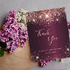 Un carte de remerciements pour un 50ème anniversaire (ou tout âge). Une couleur arrière - plan à l'aspect faux métallique bordeaux. Avec de la poussière de parties scintillant en or rose. Sur le devant un script écrit à grande main et le texte : Merci, votre texte, titre et une date. Retour : Modèle pour Votre mot de remerciement et nom.
