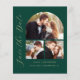 This simple, minimalist Save the Date card features a photo collage arch, with a horizontal photo at the top and two square photos below. The words "Save the Date" run vertically up the left margin in elegant gold-coloured handwriting script. The couple's names, wedding date and city appear below the photo collage in sans serif font on an emerald green background. Add a more detailed message with additional information on the back, along with a QR code to help your guests visit your wedding website.