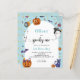 Design feature cute little ghost, pumpkin, spider web, cat and halloween cadies and cat with pastel pink arch background. Fun playful script text "spooky one"
