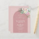 This modern boho design features a dusty rose arch shape decorated with a lush pink and white tropical floral bouquet accented with dried palm leaves and eucalyptus sprigs on a pale dusty rose background. The word "wedding" appears in elegant white script. Personalize the invitation with the names of the bride and groom in a combination of serif and sans serif typography and the wedding details in italics. The back of the card is solid pale dusty rose.