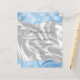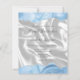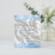 The top and bottom edges of this elegant modern wedding invitation feature a pastel baby blue watercolor agate border trimmed with faux silver glitter. The customizable text combines handwriting, sans serif and italic fonts in charcoal grey on a background image of white silk. The reverse side features a matching baby blue agate and white silk design.
