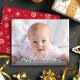 “My First Christmas.” A playful visual of champagne faux gold foil snowflakes and white handwritten script typography, overlaying the photo of your choice, helps you usher in Christmas and New Year. On the back, additional champagne faux gold snowflakes overlay a red background. Feel the warmth and joy of the holiday season whenever you send this stylish and modern personalized budget baby photo Christmas greeting card. Perfect for the newly proud parents to send to someone special!