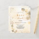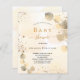 For an elegant Baby Shower. A golden watercolored background decorated with golden eucalyptus and faux gold glitter dust. Personalize and the name of the mom to be and party details. Black and golden coloured letters.
