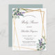 A stylish white background on the front. Decorated with eucalyptus and lavender florals. A faux gold geometric frame. Personalize and add a name and details.