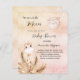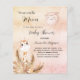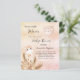 For a modern boho style baby shower. A rose gold, blush pink rustic faux metallic looking background. Decorated with a cute giraffe baby, pampas grass and a happy smiling moon. Personalize and add a name and party details.