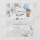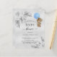 For a modern boho style baby shower. A faux silver looking background. Decorated with non-coloured roses, pampas grass and a teddy bear boy holding a light blue balloon. Personalize and add a name and party details.