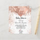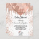 For a baby shower, celebrating a baby girl. A chic white background. Decorated with rose gold, pink faux glitter drips, paint dripping look, balloons and a cute little baby elephant girl. Personalize and add the name of the mom to-be's name and party details. The name and the text: Baby Shower are written with a hand lettered style script