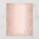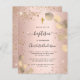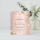A blush, rose gold background decorated with golden eucalyptus and faux glitter dust. Personalize and a name and ceremony details. Black colored letters.
