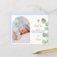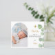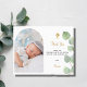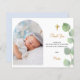 A modern and elegant baptism thank you card. A chic white background decorated with eucalyptus greenery. Personalize and add your photo of the child, thank you note and name. Photo arch frame.