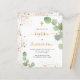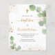 A white background decorated with eucalyptus greenery and faux gold glitter dust. Personalize and a name and ceremony details. Black and golden coloured letters.