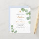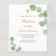 A white background decorated with eucalyptus greenery and a golden cross. Personalize and the childs name and ceremony details. Black and golden coloured letters.