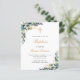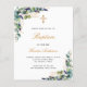 A white background decorated with eucalyptus greenery and golden leaves and a golden cross. Personalize and the childs name and ceremony details. Black and golden coloured letters.