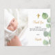 A modern and elegant baptism thank you card. A chic white background decorated with eucalyptus greenery. Personalize and add your photo of the child, thank you note and name. Gender neutral.