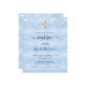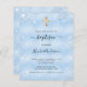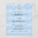For a baptism, celebrating a baby boy. A blue faux metallic looking background. Decorated with blue faux glitter dust. Personalize and add the name and details. The name and baptism are written with a hand lettered style script