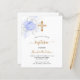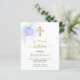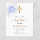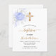 For an elegant baptism, celebrating a baby boy. A chic white background. Decorated with light blue and white florals, roses and a faux gold cross. Personalize and add the name of the child and details. Black and golden letters.