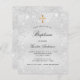 A modern, elegant and minimalist baptism invitation for both boys or girls. Faux silver metallic looking background decorated with faux glitter dust. Personalize and add a name and details. Black coloured letters.