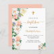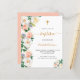 A trendy floral baptism invitation in white, pink and rose gold . A chic white background on the front. Decorated with large, lush watercolored flowers, florals . Personalize and add the name of the child and ceremony detail. Black and golden coloured text.