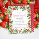 This is a cute strawberry based and budget friendly baby shower invitation featuring a frame of strawberries, white flowers and greenery.