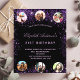 A girly and feminine 21st (or any age) birthday party invitation. On front: A chic black background. Decorated with dark purple faux glitter dust. Personalize and add a name, party details and 6 photos. The name is written with a hand lettered style script, light purple coloured letters.