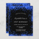 A girly and feminine 21st (or any age) birthday party invitation. On front: A chic black background. Decorated with royal blue faux glitter dust. Personalize and add a name and party details. The name is written with a hand lettered style script.