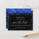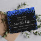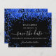 A black background decorated with royal blue confetti. Personalize and add a date and name/age. The text: Save the Date is written with a large trendy hand lettered style script.