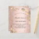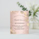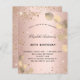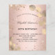A blush, rose gold background decorated with eucalyptus greenery and faux glitter dust. Personalize and a name and party details. Black colored letters.