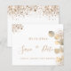 A girly and trendy Save the Date card for a 40th (or any age) birthday party. A stylish white background decorated with golden eucalyptus foliage and faux gold glitter dust. Personalize and add a date and name and text. Golden coloured letters. The text: Save the Date is written with a large trendy hand lettered style script.
