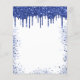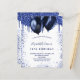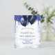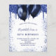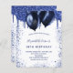 A girly and feminine 18th (or any age) birthday party invitation. On front: A white background. Decorated with navy blue faux glitter drips, paint dripping look and balloons. Personalize and add a name and party details. The name is written with a hand lettered style script.