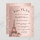 A modern, stylish and glamourous invitation for a 18th (or any age) birthday party, parisian theme. A faux rose gold metallic looking background with faux glitter sparkles and the Eiffel tower with some flowers. The name is written with a modern hand lettered style script. Personalize and add your party details.