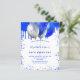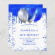A white background. Decorated with royal blue faux glitter drips paint dripping look, sparkles. Royal blue and faux silver balloons. Personalize and add a name and party details. The name is written with a hand lettered style script.