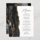 The left-hand edge of this elegant modern wedding menu features a black watercolor agate design trimmed with faux gold glitter. The customizable text combines charcoal grey handwriting script and sans serif fonts on a white background. The black and gold agate design is repeated on the reverse side.