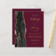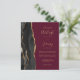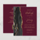 Save the cost of printing and mailing separate RSVP cards with this elegant modern all-in-one budget wedding invitation. The left-hand edge features a black watercolor agate border trimmed with gold faux glitter. The customizable text combines gold-coloured handwriting, copperplate and italic fonts on a burgundy background. The reverse side provides space for wedding details on a solid burgundy background, along with a QR code guests can scan to visit your website and RSVP.