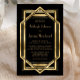 This elegant vintage-inspired wedding invitation features gold-coloured text on a black background, framed by a geometric vintage art deco design. A coordinating gold and black art deco fan pattern decorates the back of the card.
