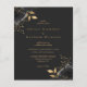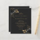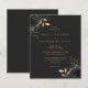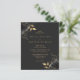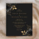 This romantic floral wedding invitation features black floral bouquets set off with gold faux foil foliage in two corners. The names of the couple appear in classic gold-coloured serif font, with the remaining text in italics, on a dark slate black background. The back of the card is solid slate black.