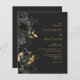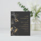 This dark, moody floral wedding invitation features a border of black flowers set off with gold faux foil foliage. The names of the couple appear in classic gold-coloured serif font, with the remaining text in italics, on an off-black background.