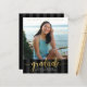 Be proud, rejoice and announce to the world that your favourite grad has reached their milestone with this stunning, simple, modern, personalized budget announcement invite. Sparkly, elegant, faux gold glitter calligraphy script, white sans serif typography and a photo of your choice overlay a black and dark grey striped background. Personalize the custom text with your graduate’s name, school name, class year, and graduation date. On the back, add your personal note, next school they’re attending, party information, etc. Guaranteed to add stylish fun to their special occasion!