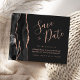 This elegant budget save the date card features a black watercolor agate border trimmed with faux rose gold glitter. The customizable text combines rose coloured handwriting script, copperplate and italic fonts on a charcoal grey background. The reverse side features a matching black and rose gold agate design.