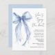 Budget-friendly bridal shower invitation featuring a light blue coquette bow watercolor, "She's tying the knot" in a chic modern calligraphy script, and her name and your shower details in simple lettering. This budget semi-gloss paper is similar in weight to photo paper. A larger 5x7 traditional card stock version is also available (message us for the link).