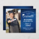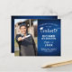 A budget-friendly, modern blue and white graduation announcement printed on 4.5x5.6-inch lightweight paper instead of cardstock personalized with your graduate's photo, name, class year and school name and/or degree (or change the text to your custom message) with the title CONGRATULATIONS TO OUR GRADUATE in modern, hand lettered brush stroke typography accented with a graduation cap or mortarboard against a two-toned brushed metallic blue background. Ideal for conservative budgets and/or hand delivering. ASSISTANCE: For help with design modification or personalization, colour change, resizing or transferring the design to another product, contact the designer BEFORE ORDERING via the Zazzle Chat MESSAGE tab or email makeitaboutyoustore@gmail.com.