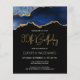 This trendy 90th birthday invitation features a watercolor image of an agate geode in shades of blue with faux gold highlights. The words "90th Birthday" appear in faux gold glitter in decorative modern handwriting font. Customize it with the name of the honoree in gold coloured text and the details in white. The same blue agate image appears on the reverse side.