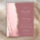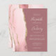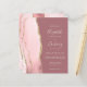 The left-hand edge of this elegant modern wedding invitation features a blush pink watercolor agate border trimmed with faux gold glitter. The customizable text combines pale blush handwriting, copperplate and italic fonts on a deep dusty rose background. The reverse side features a matching blush and gold agate design.