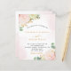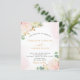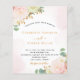 A white background with soft blush pink and rose gold watercolor brush strokes. background. Decorated with watercolored flowers, florals pink roses, white orchids and a yellow gerbera, eucalyptus greenery and faux gold sprigs. Personalize and add your names and wedding details. Black and golden coloured letters.