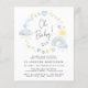 Cute and whimsical budget-friendly baby boy shower invitation featuring boho-inspired pastel blue and yellow watercolors of a rainbow, sun, hearts, stars, moons and clouds and "Oh Baby!" in a stylish calligraphy script.