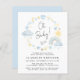 Cute budget-friendly whimsical baby boy sprinkle invitation that features boho-inspired pastel blue and yellow watercolors of a rainbow, sun, hearts, stars, moons and clouds and "Oh Baby!" in a stylish calligraphy script.