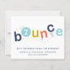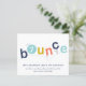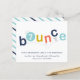 This bounce birthday party invitation features bouncing letters in navy blue, aqua, yellow and orange with the editable age in the O.